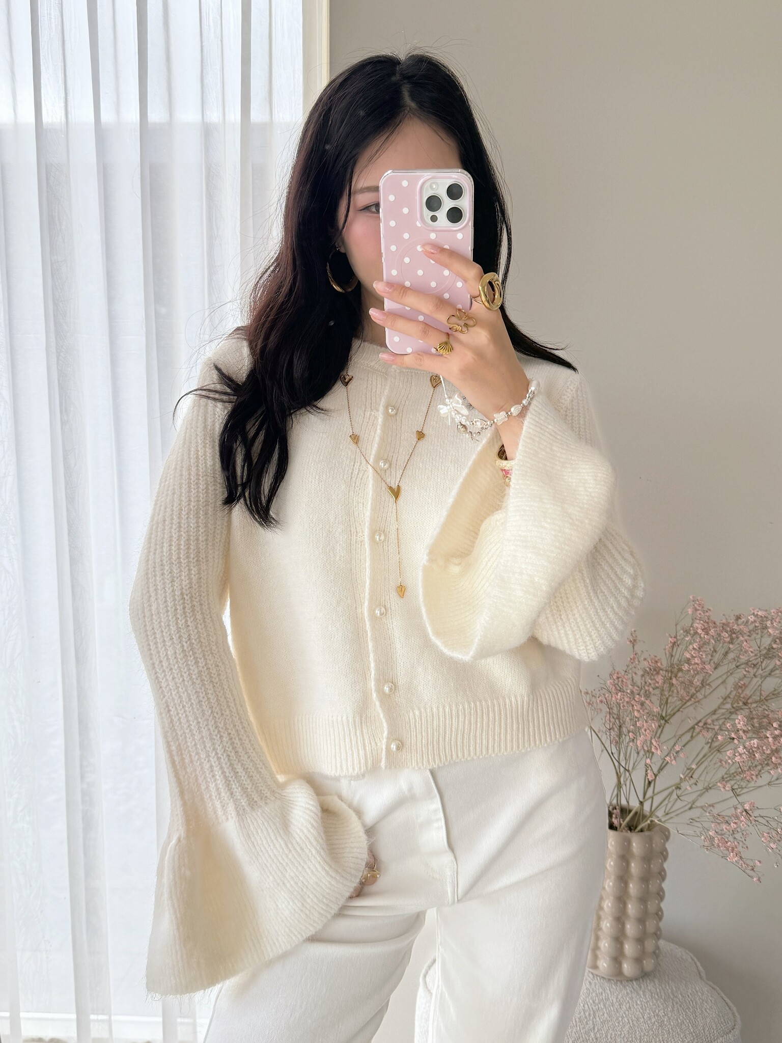Cozy up in our Alaia Bell Sleeve Knit Cardigan! Also available in pink.