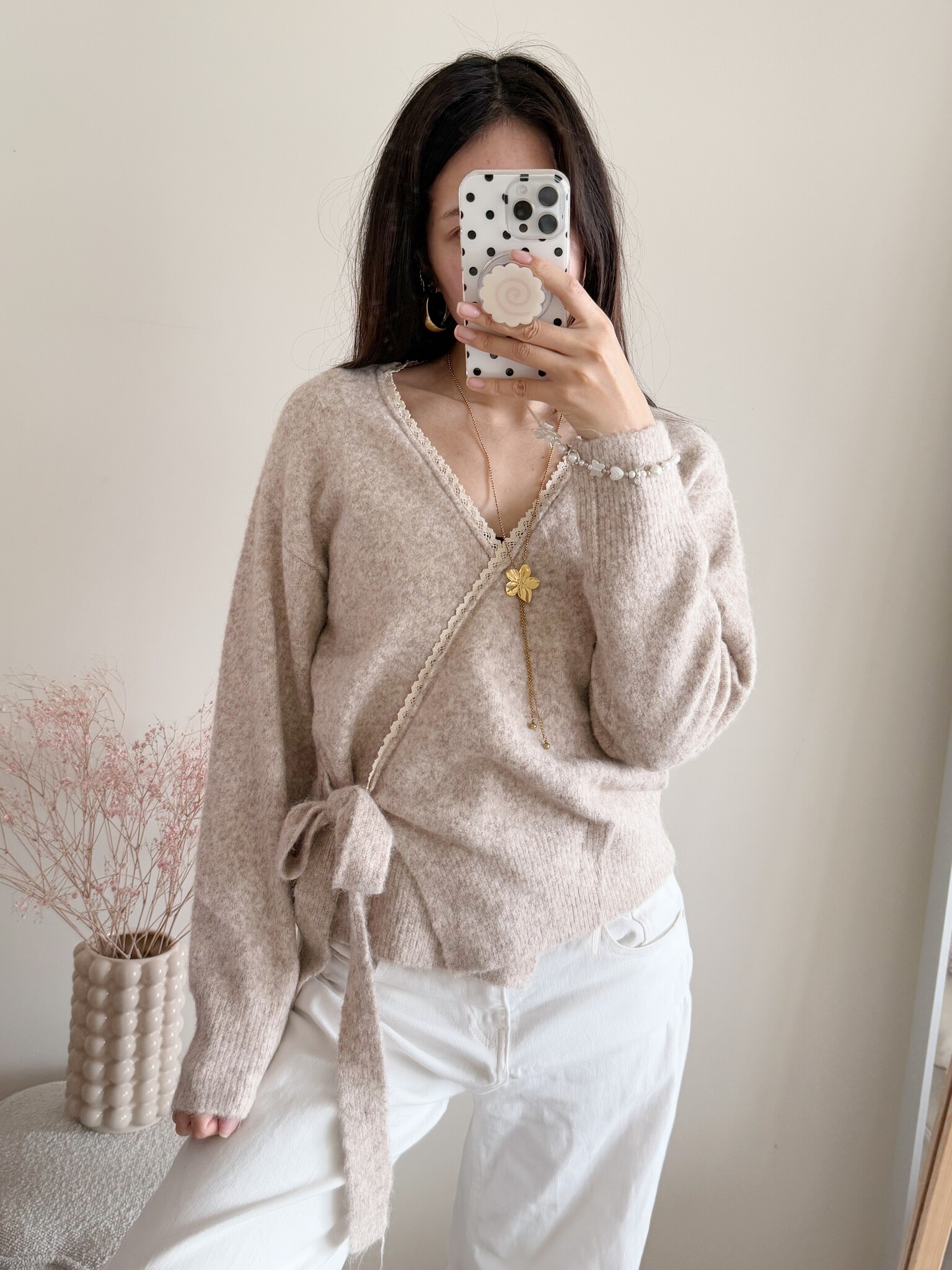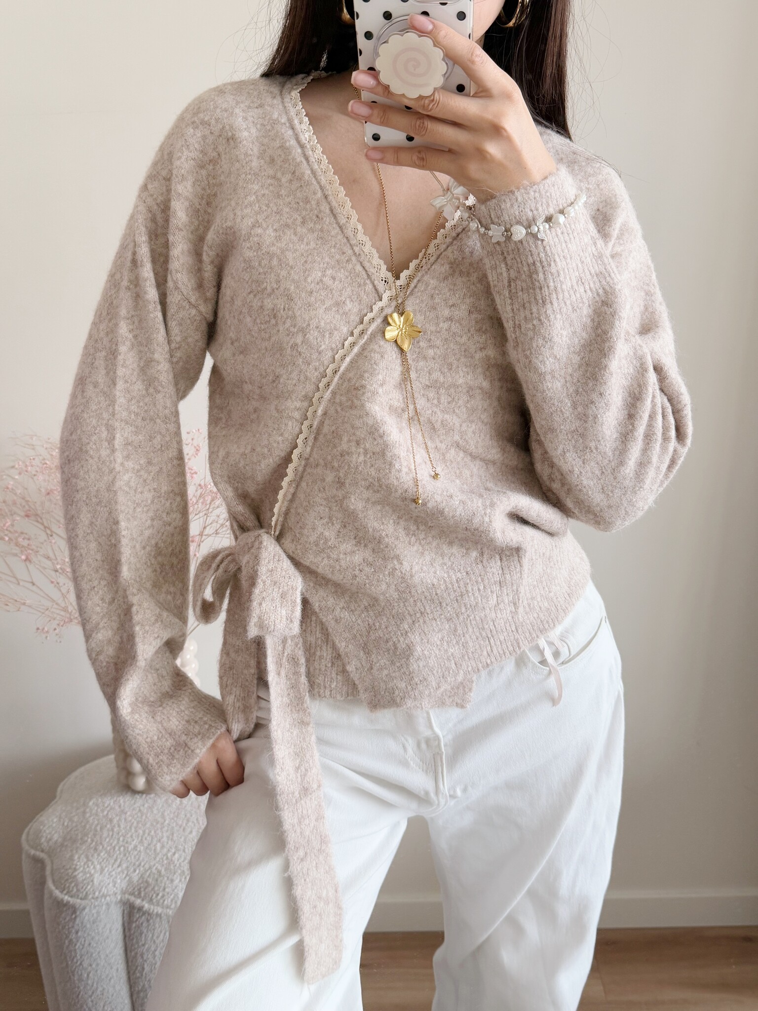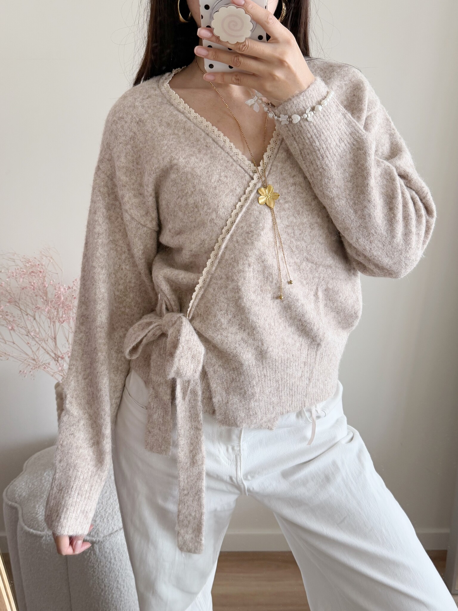 Onze Elea Wrap Cardigan is een prachtig wikkelvestje met schattig geborduurd randje! Heel leuk in combinatie met jeans of rok.