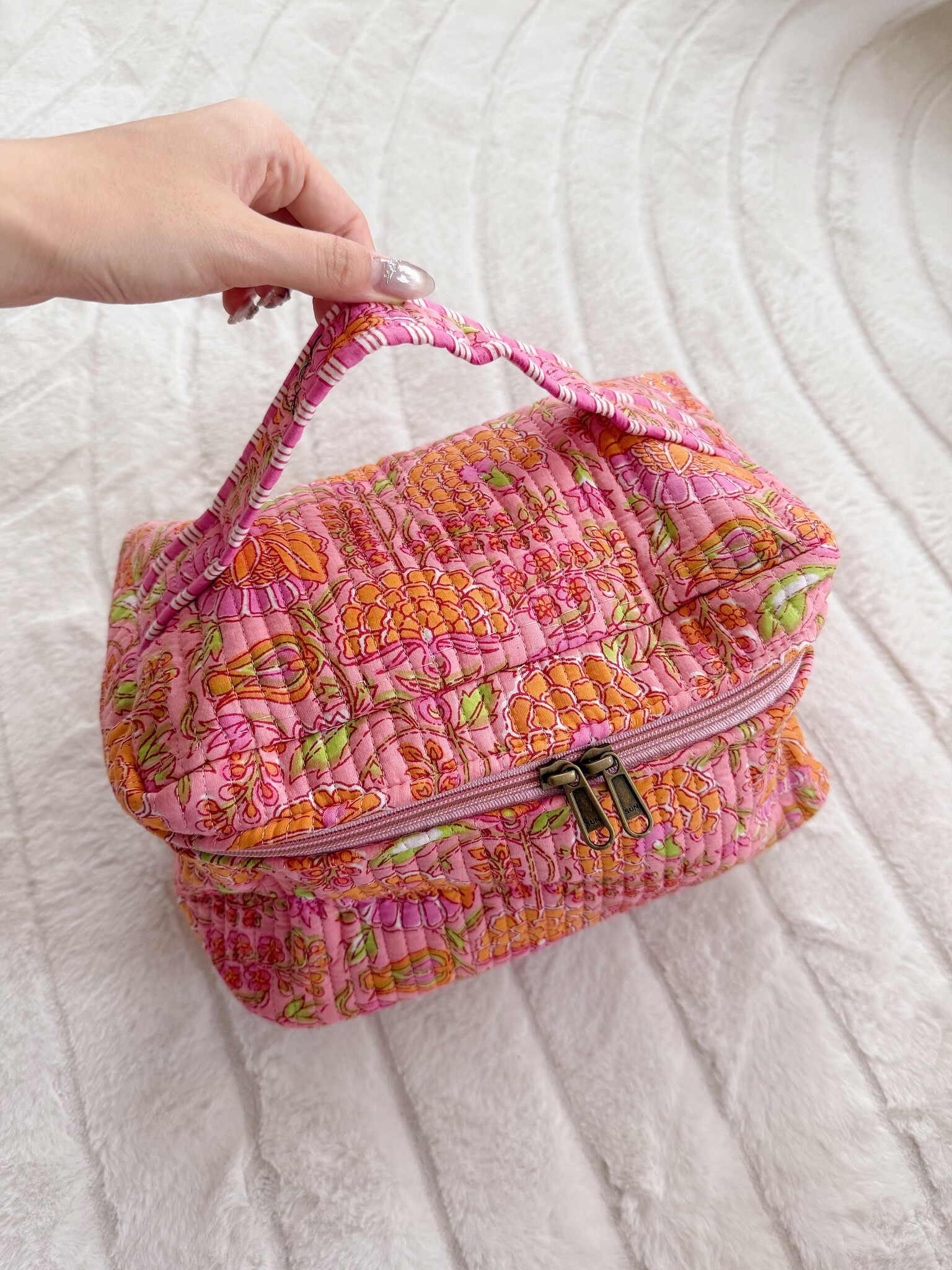 Een cute toilettas met mooie bloemenprint! Perfecte formaat om je make-up en toilet artikelen in te bewaren zoals droogshampoo, haarspray, setting spray etc.