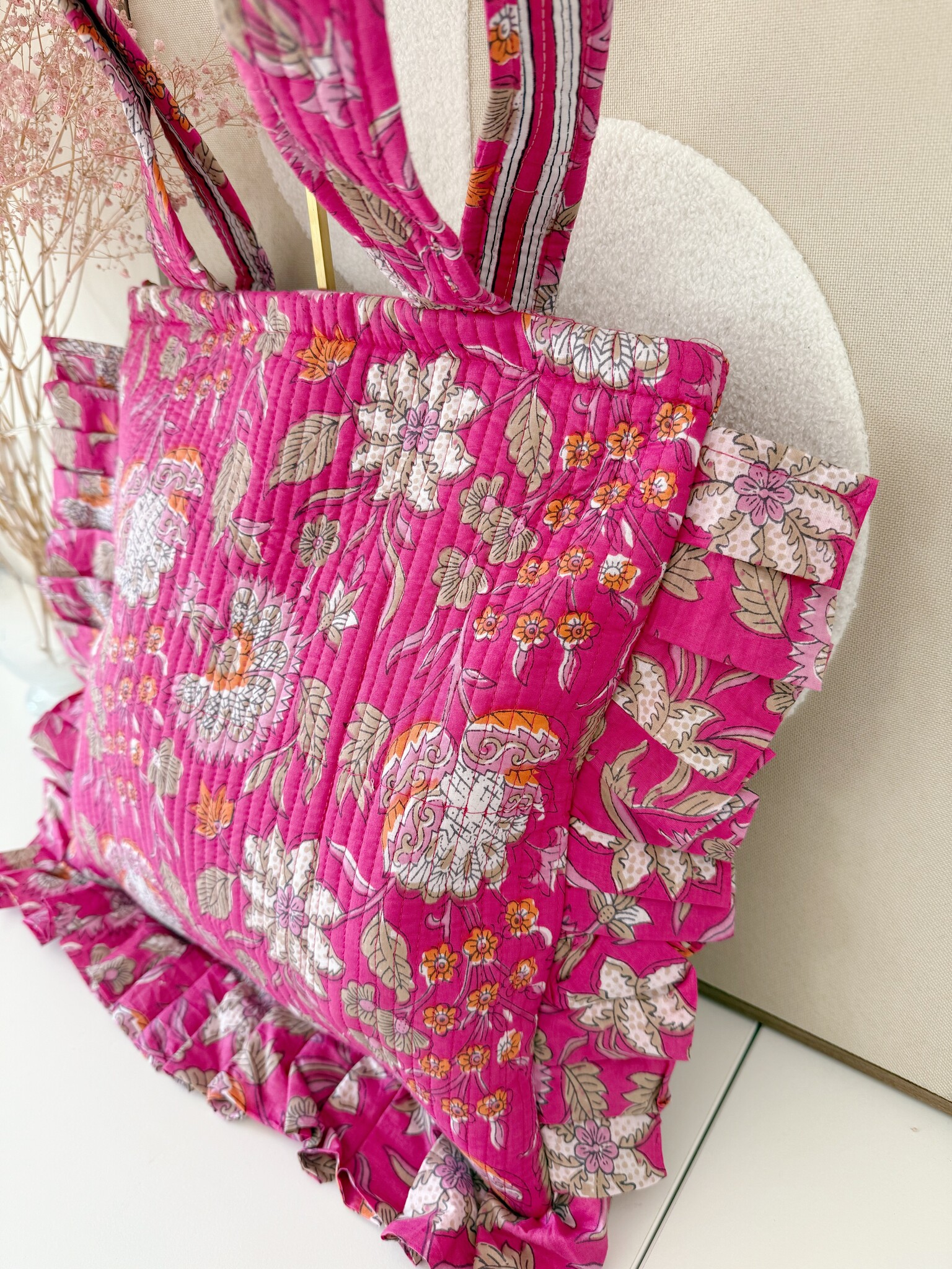 Onze Micky Small Ruffle Flower Shopper Bag heeft een prachtige boho bloemenprint en het perfecte formaat om je essentials te bewaren! Deze kleine shopper tas is super leuk om te dragen als weekend tas, strandtas en sporttas. Love this one? We hebben de tas in verschillende maten, prints en kleuren.