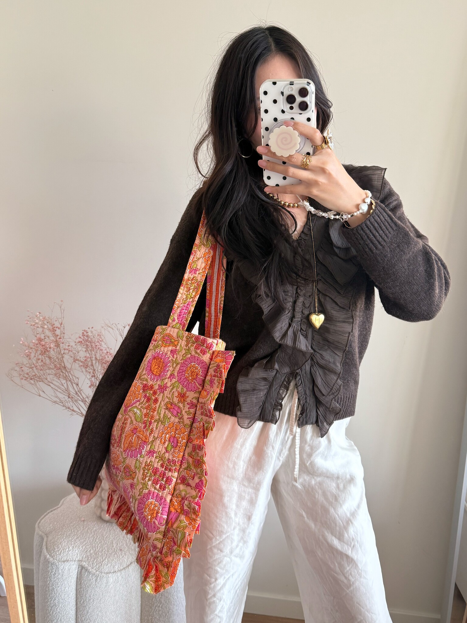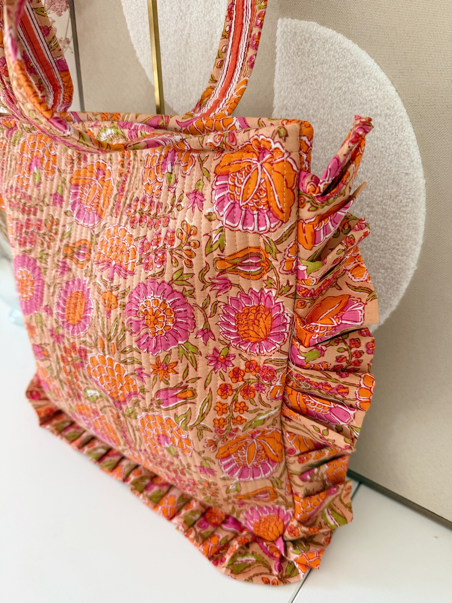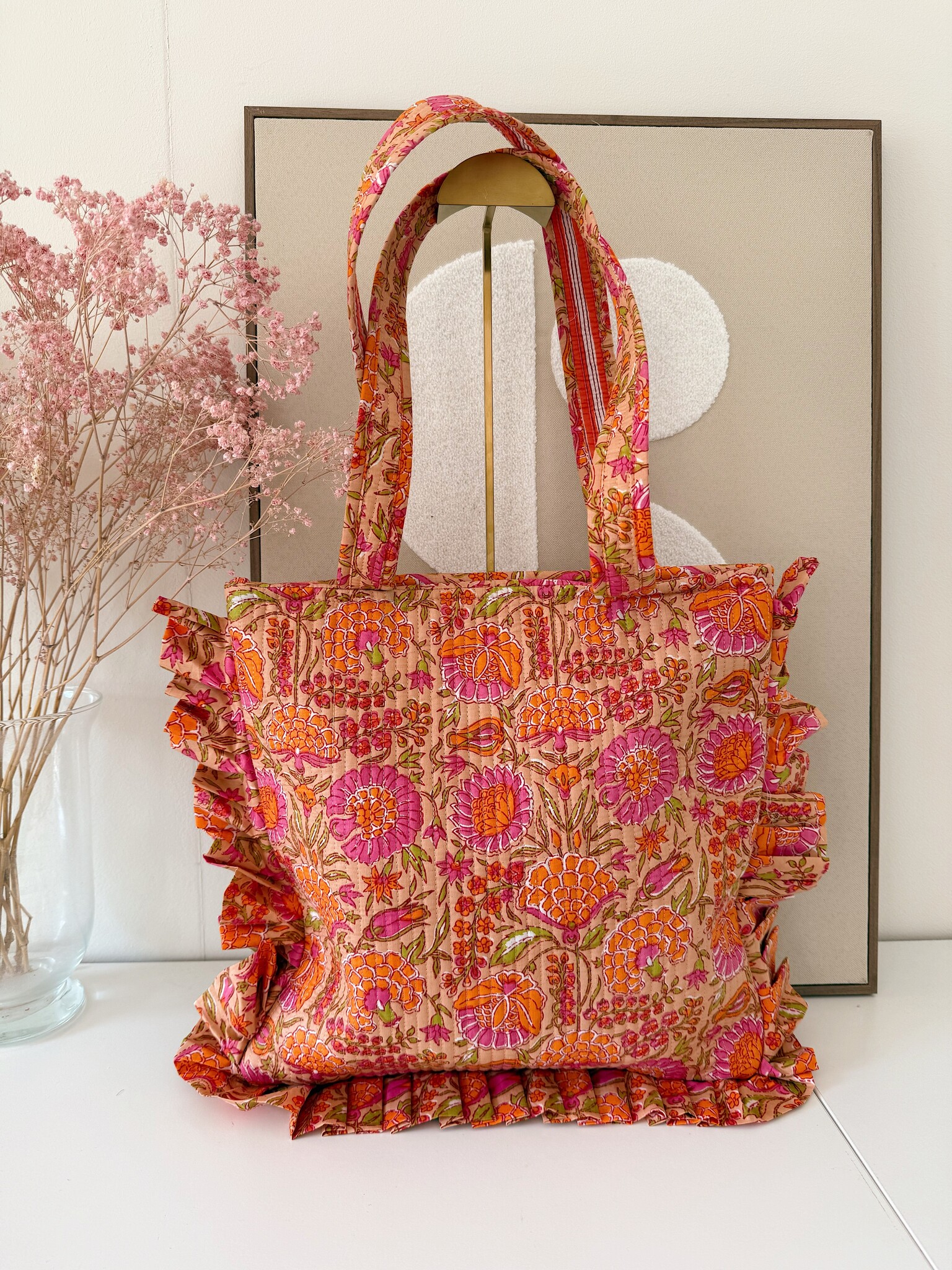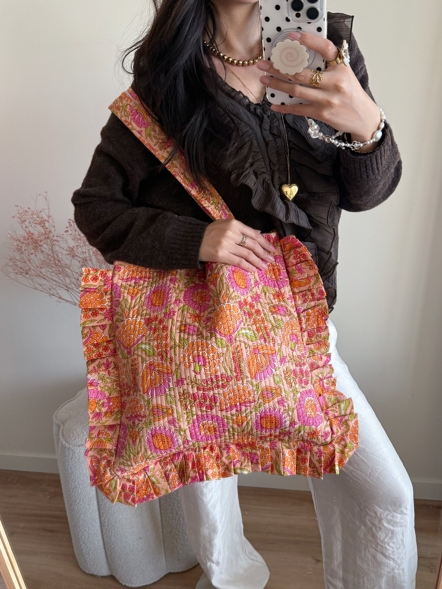 Onze Micky Small Ruffle Flower Shopper Bag heeft een prachtige boho bloemenprint en het perfecte formaat om je essentials te bewaren! Deze kleine shopper tas is super leuk om te dragen als weekend tas, strandtas en sporttas. Love this one? We hebben de tas in verschillende maten, prints en kleuren.
