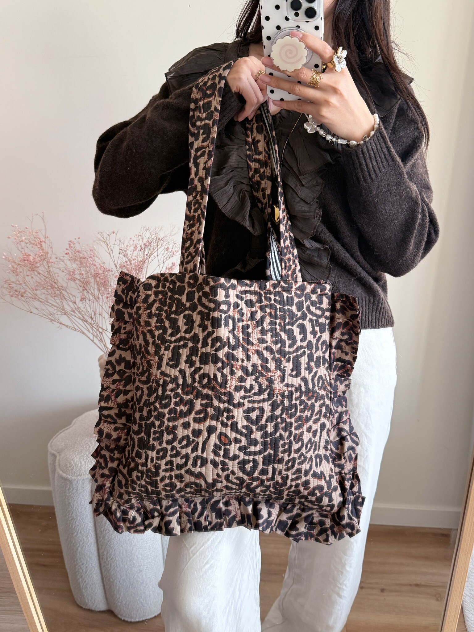 Onze Micky Small Ruffle Leopard Shopper Bag heeft een prachtige panterprint en het perfecte formaat om je essentials te bewaren! Deze kleine shopper tas is super leuk om te dragen als weekend tas, strandtas en sporttas. Love this one? We hebben de tas in verschillende maten, prints en kleuren.