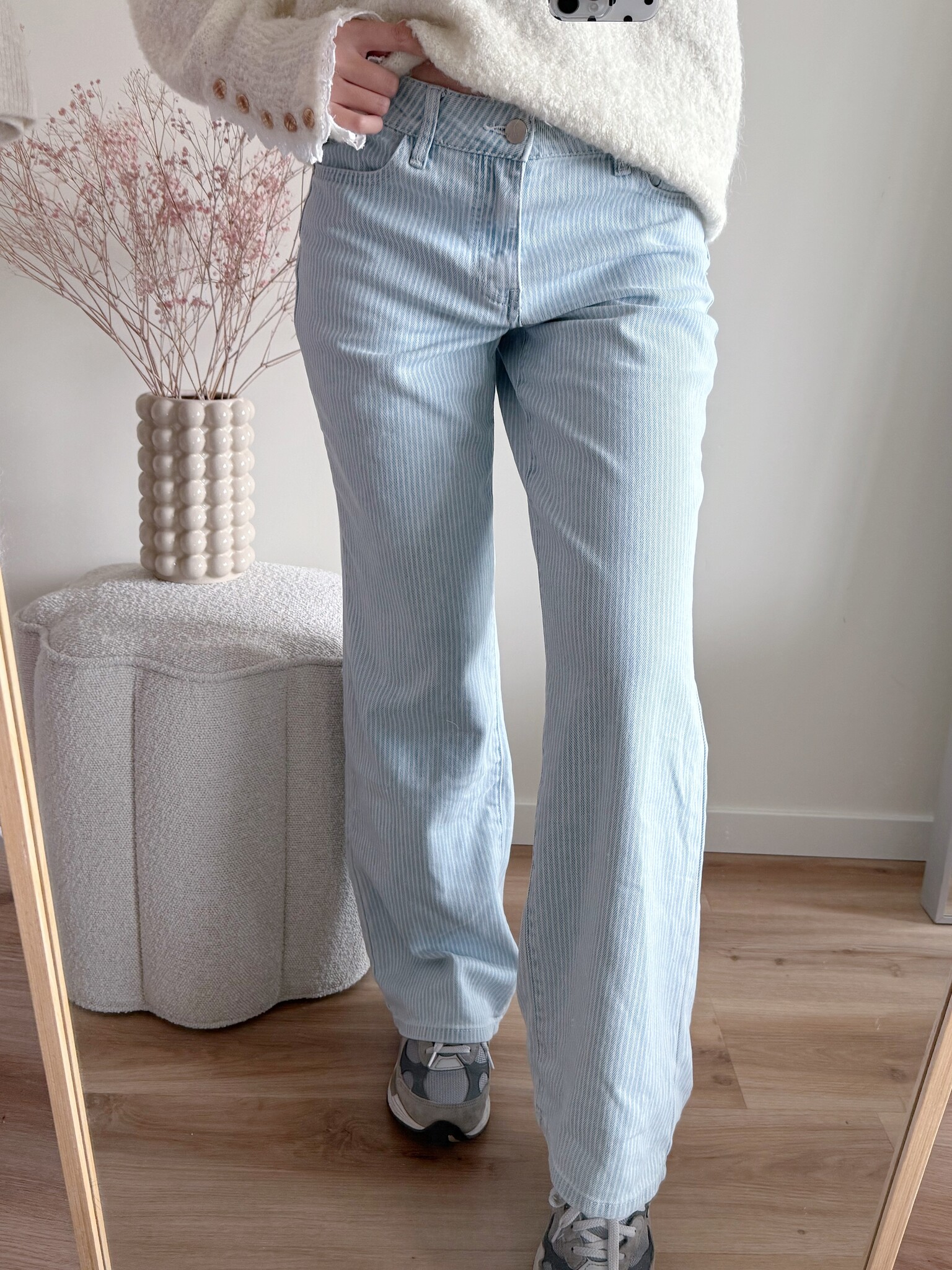 Onze Sona Striped Jeans heeft een mid waist wide leg fit. Deze mooie streepjes broek is super leuk om te combineren met een oversized trui of schattig blousje!