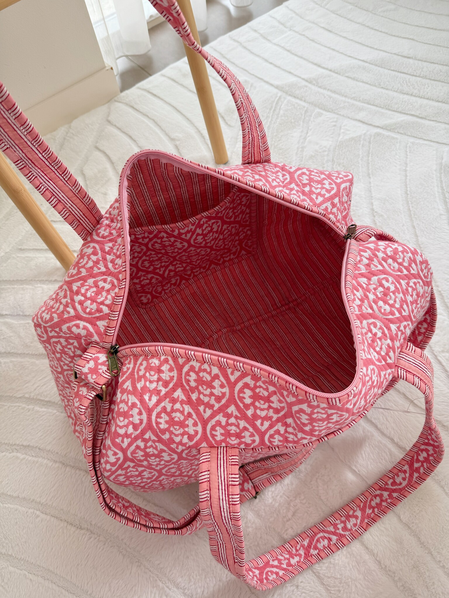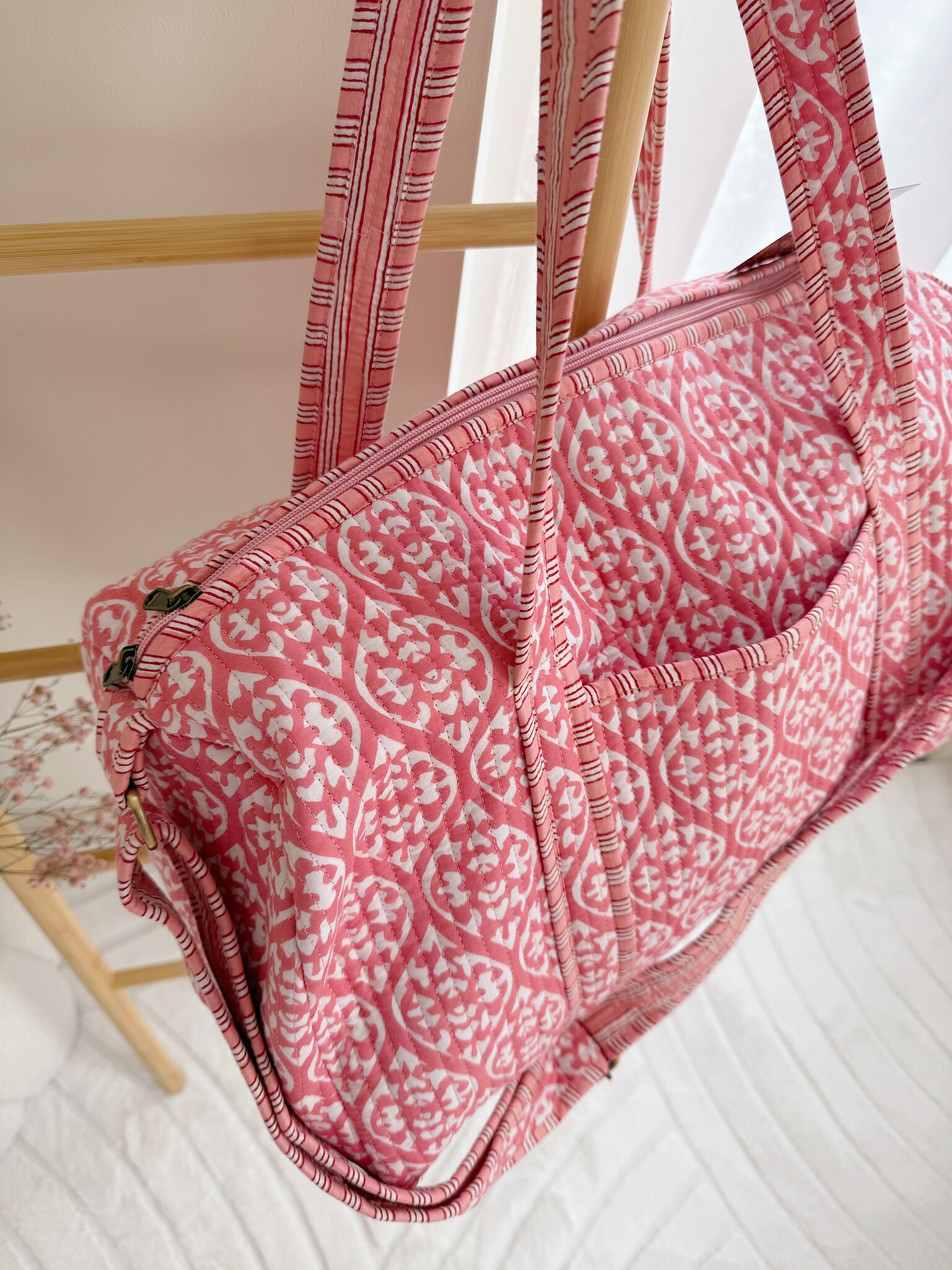Onze Yasmina Flower Travel Bag heeft een prachtige boho bloemenprint en het perfecte formaat om je essentials te bewaren! Deze duffel bag is super leuk om te dragen als weekend tas, strandtas, sporttas en/of luiertas. Love this one? We hebben de tas in verschillende maten, prints en kleuren.