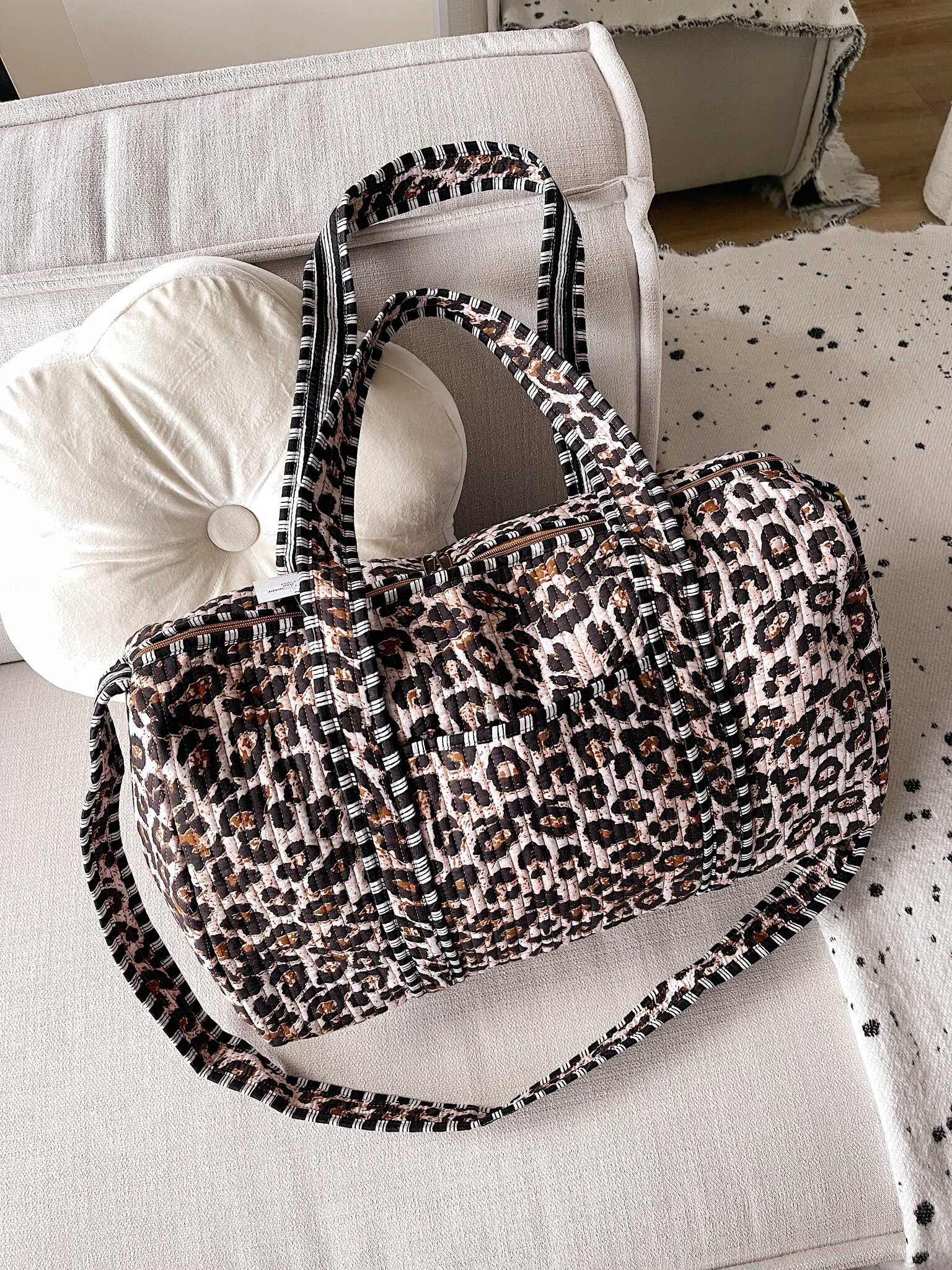 Onze Yasmina Leopard Travel Bag heeft een prachtige panterprint en het perfecte formaat om je essentials te bewaren! Deze duffel bag is super leuk om te dragen als weekend tas, strandtas, sporttas en/of luiertas. Love this one? We hebben de tas in verschillende maten, prints en kleuren.